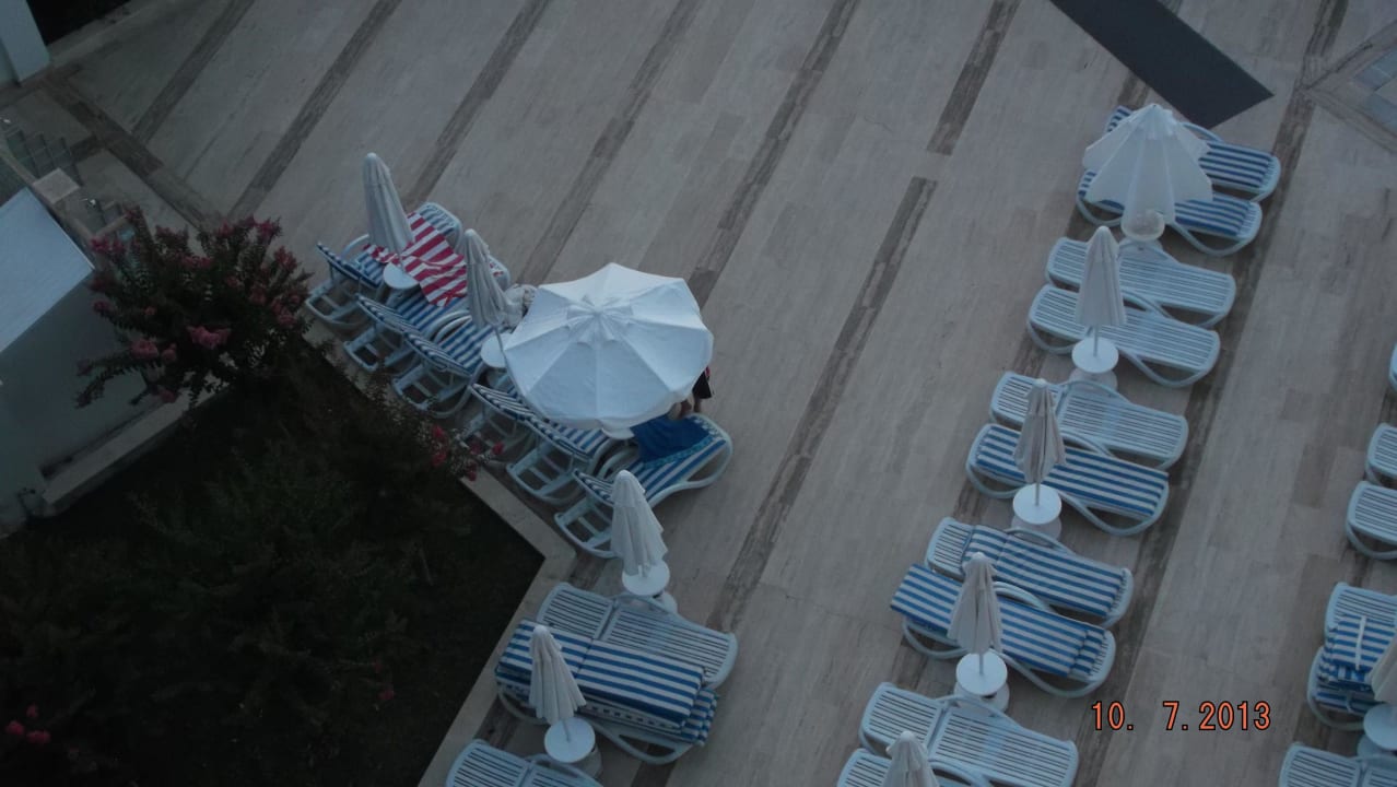 6 Liegen und 3 Schirme, kurz nach 05:00, BESETZT! Die Sonne scheint noch lange nicht, aber die Handtücher sind gut beschirmt. Total bekloppt!!!