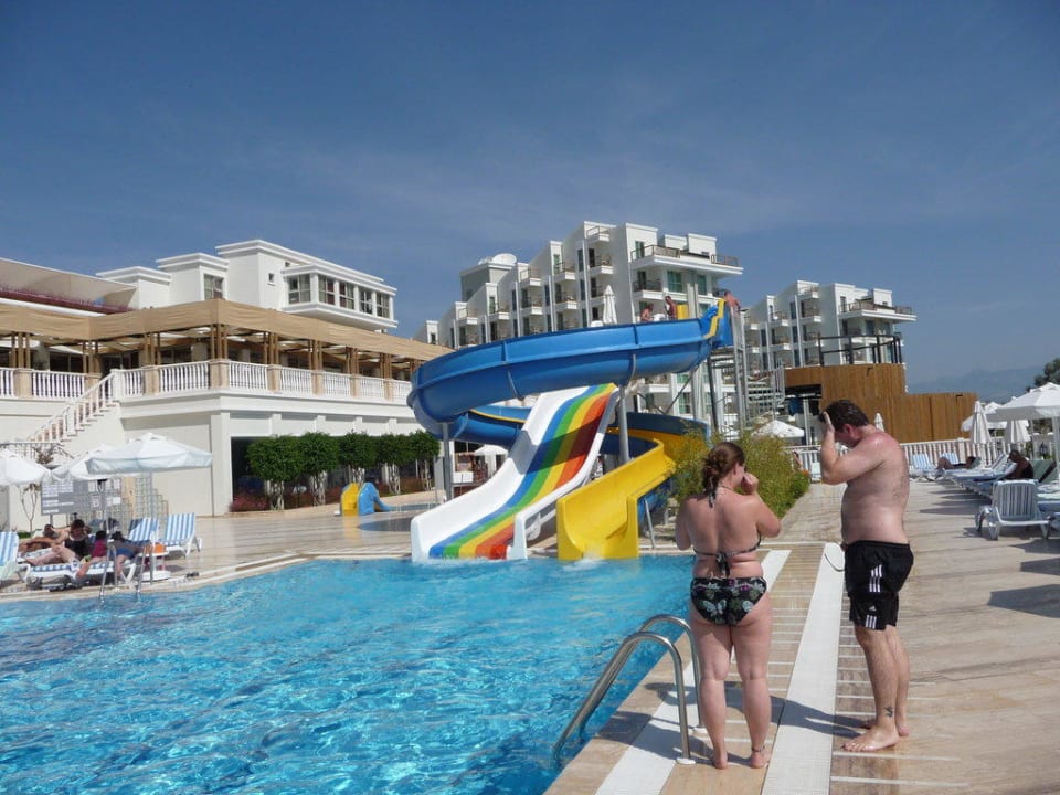 Aktivpool mit Rutschen , im Hintergrund das Hauptrestaurant