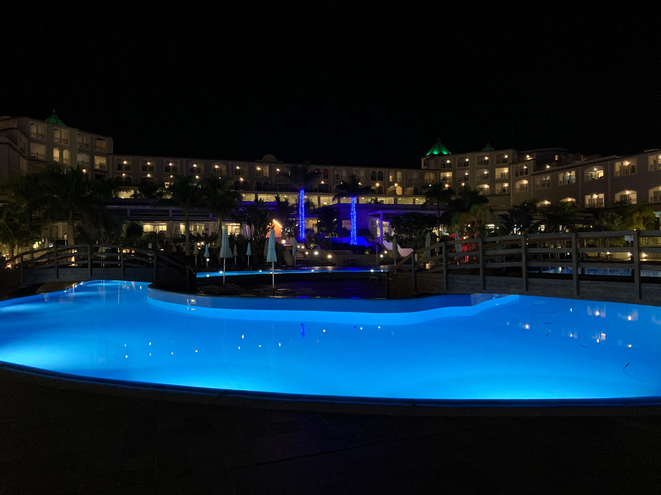 Oberer Pool mit Haupthaus am Abend