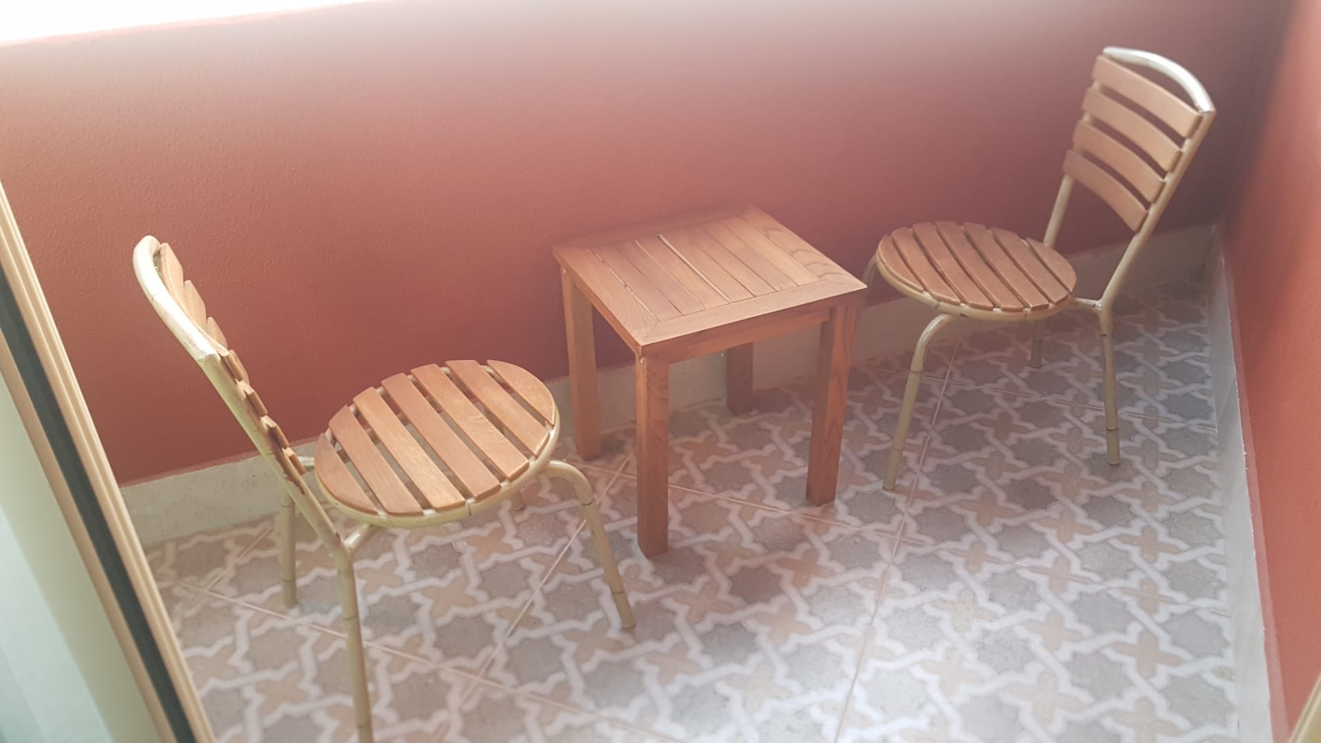 ZimmerBalkonmöbel von der Grösse für Kinder, aber nicht für normale Erwachsene über 1,70. Auf dem Balkon wollte man nicht lange verweilen