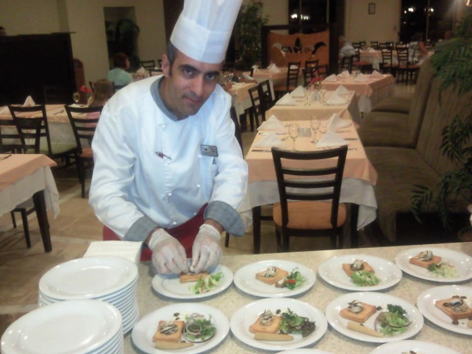 Koch beim Garnieren der Vorspeise des Fischabends