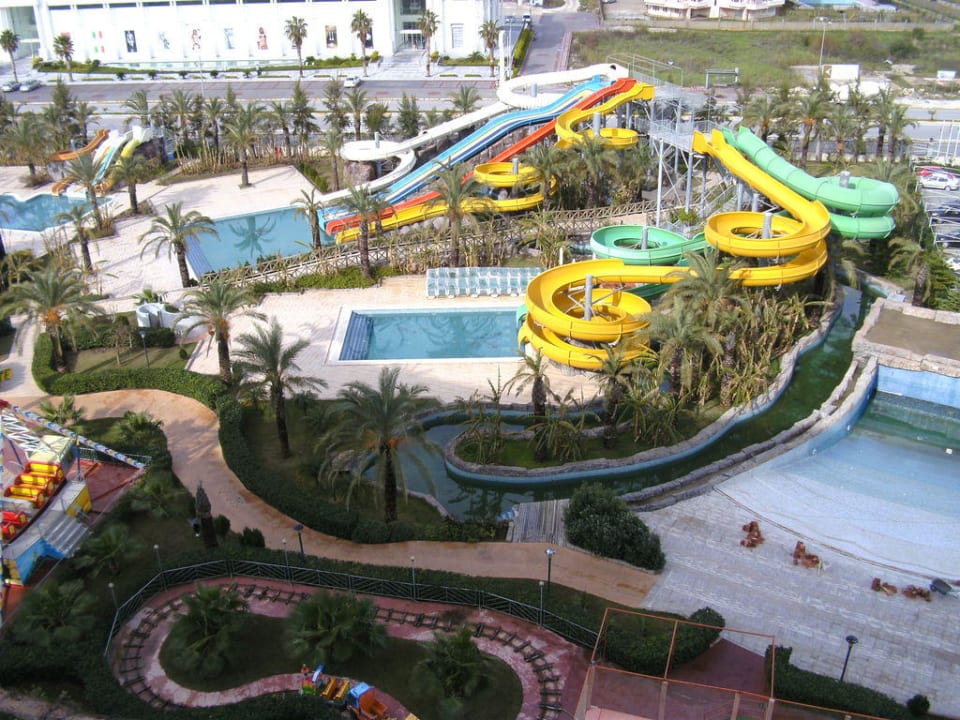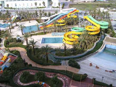 Blick auf das "Kinderparadis" mit kleinem Rummelplatz und Wasserrutschen