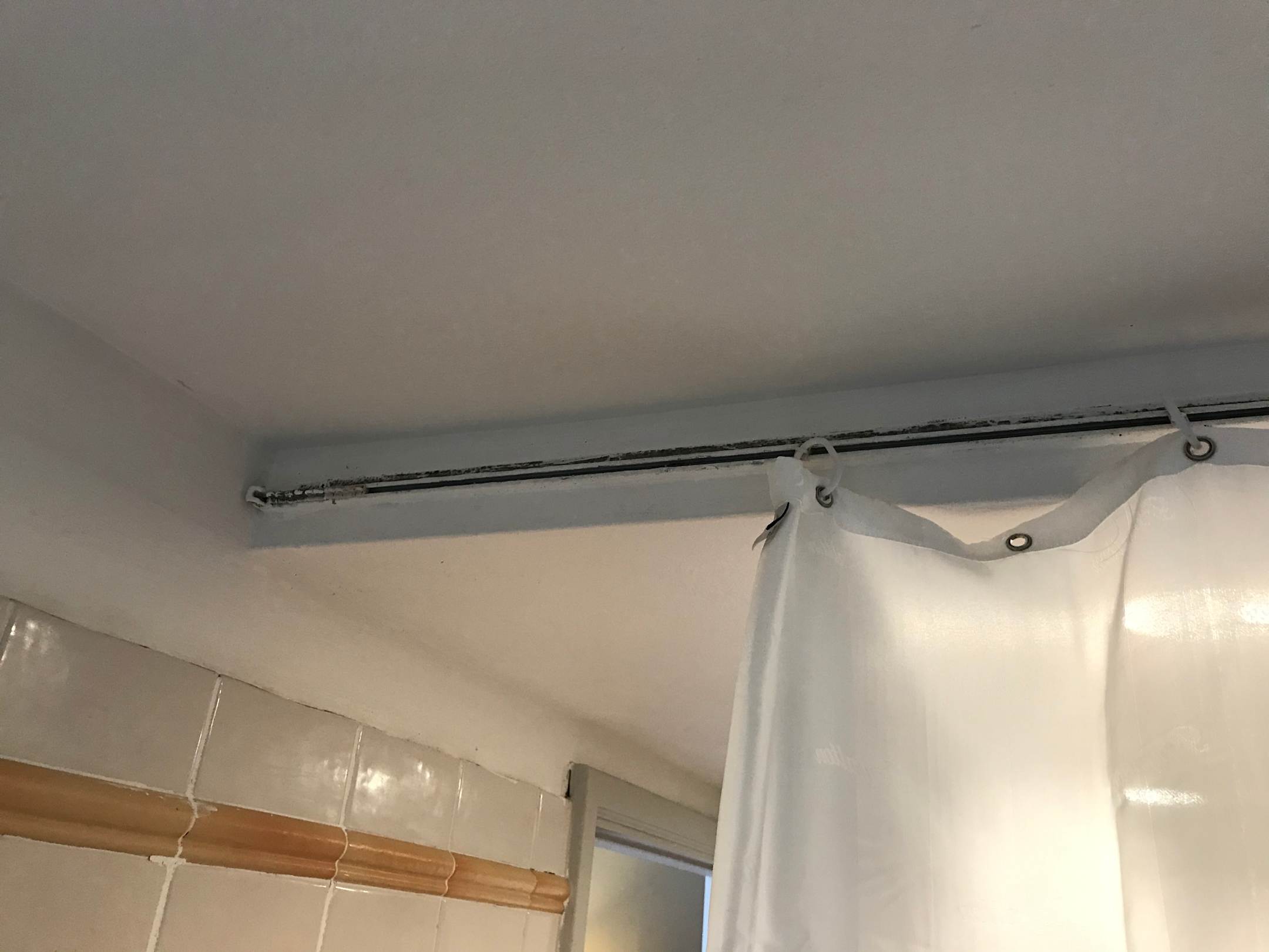 ZimmerDuschbereich von innen, zugeschimmelte Vorhangschiene. Vorhang nur notdürftig eingehängt