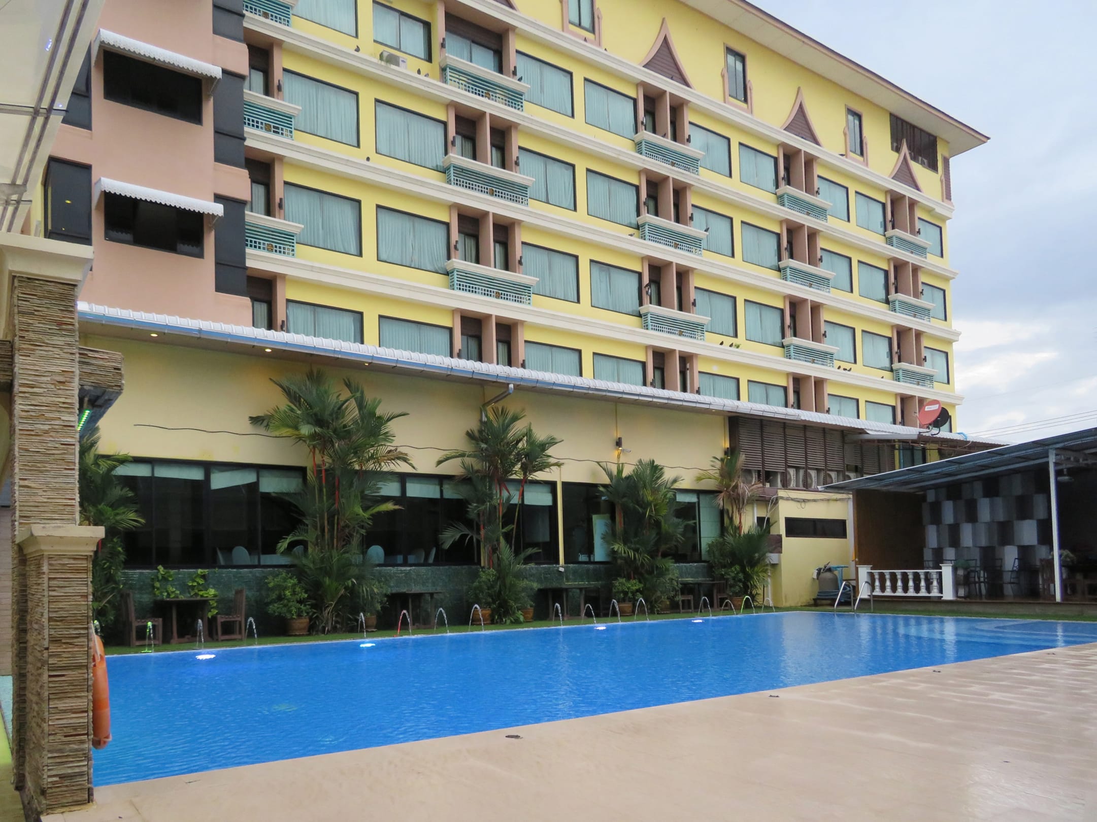 Pool mit Hotelrückfront
