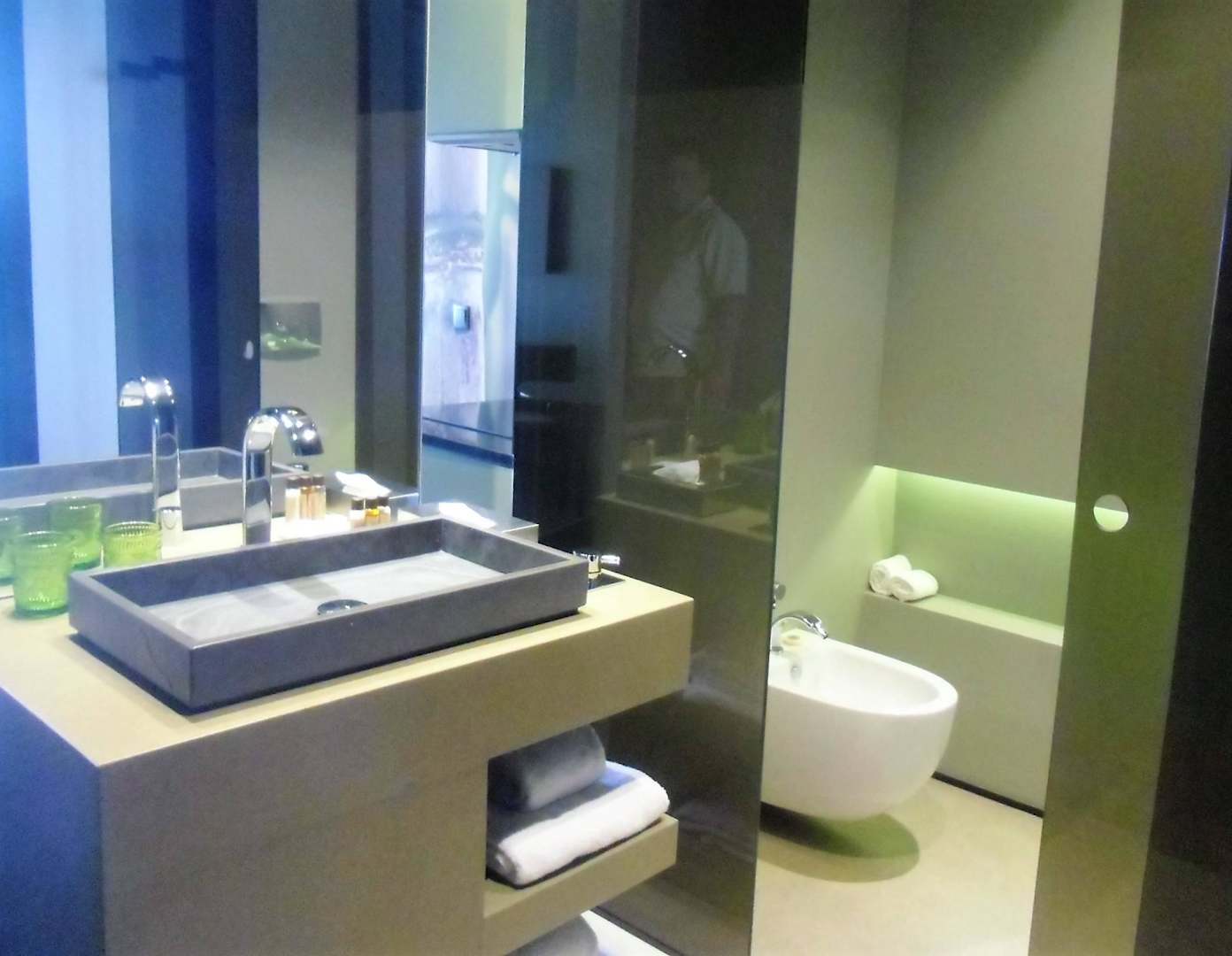 Alles ist offen im Zimmer, nur das WC ist durch eine Glas-Schiebetür abgetrennt (sehr laut, wenn man nachts mal raus muss)