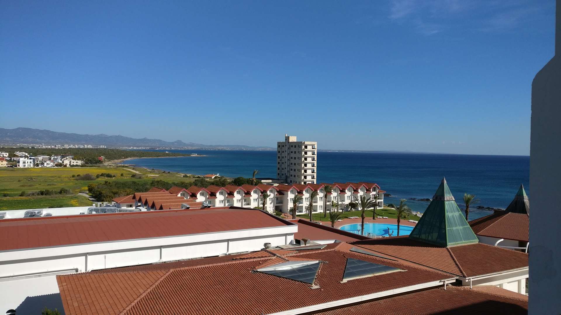 Blick aus dem 6. Stock mit seitlichem Meerblick. Hinter den Bungalows steht das verlassene und kaputte Hochhaus, wovon man in der Hotelbeschreibung keinen Hinweis findet.