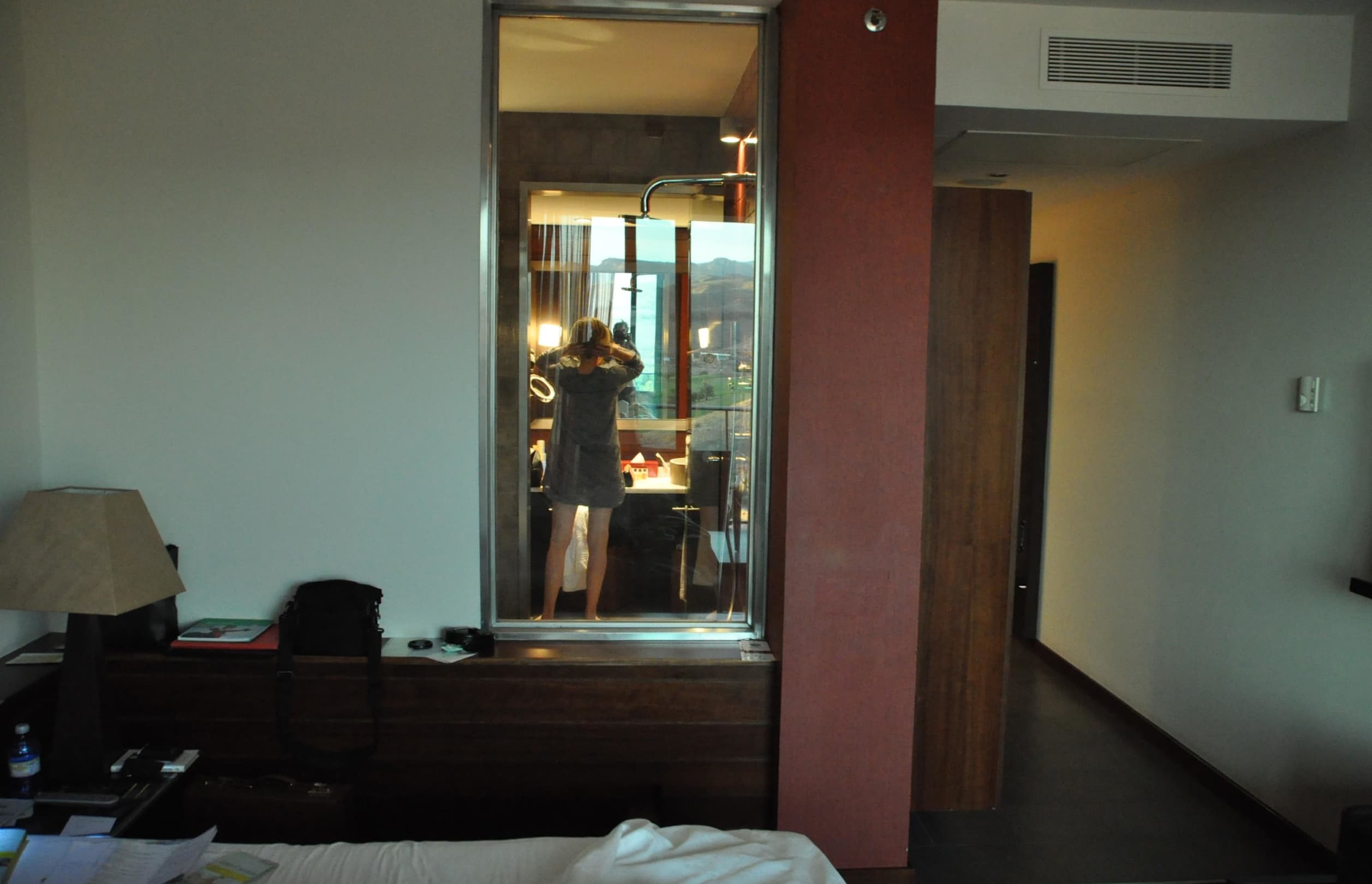 Vom Balkon aus aufgenommen, vorne die Betten, dann die Panorama-Dusche und zum Schluß die Waschbecken, über denen sich die Landschaft spiegelt.