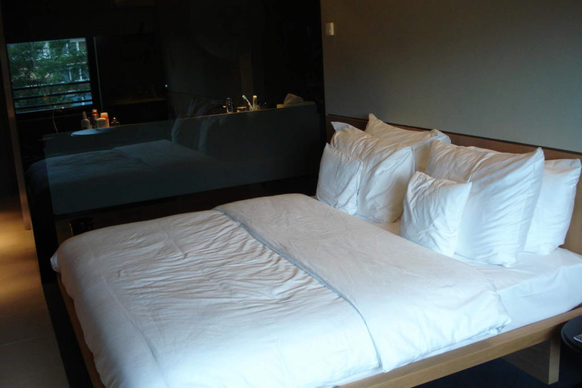 Bett und Blick zum Bad