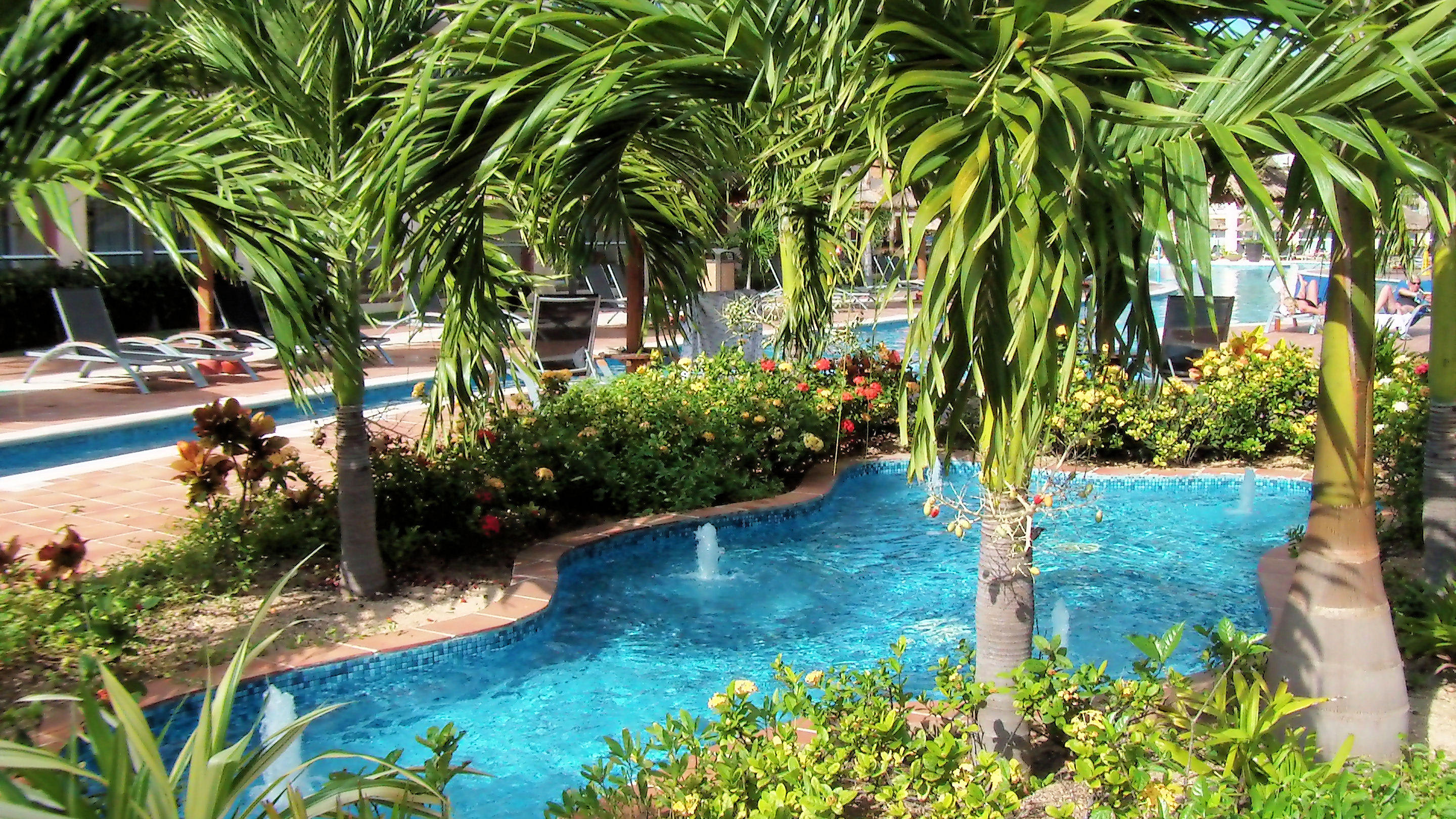 Ein kleiner Springbrunnen neben dem Pool im Haus 9