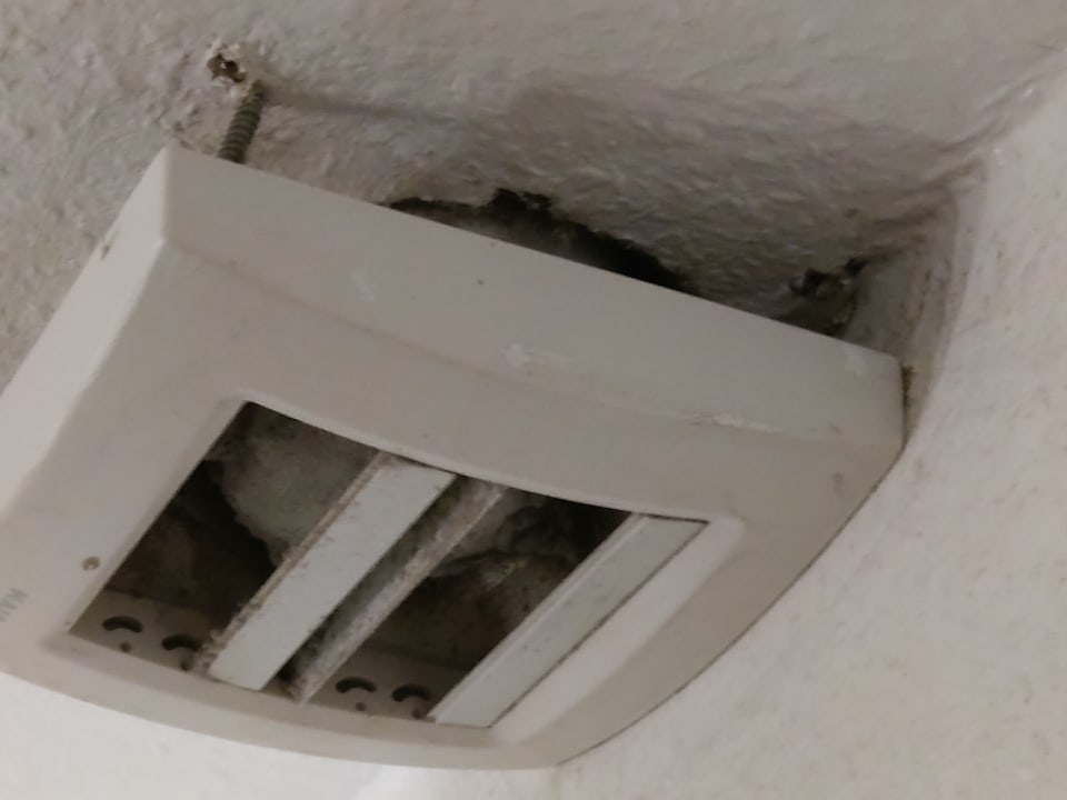 Lüfter im Bad ist marode und Schimmel zu sehen. Da kann man sich die Legionellen Krankheit holen. Zudem fällt diese fast von der Decke und ist mörderisch laut.