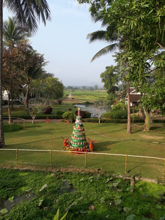 Blick auf die Gartenanlage mit angrenzenden Reisfeldern