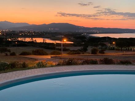 Blick von der Terrasse auf den Pool und die Bucht von Budoni
