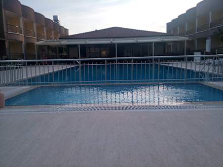 Pool mit Restaurant hinten, seitlich die Zimmer mit Balkon