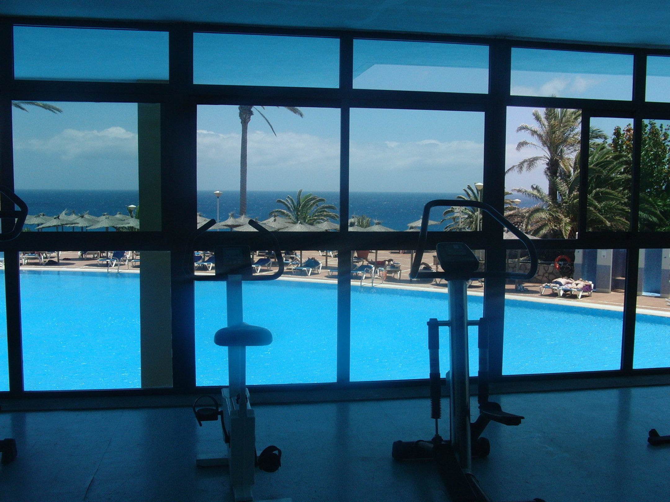 Blick vom Fitnessraum auf den Sportpool u. Meer