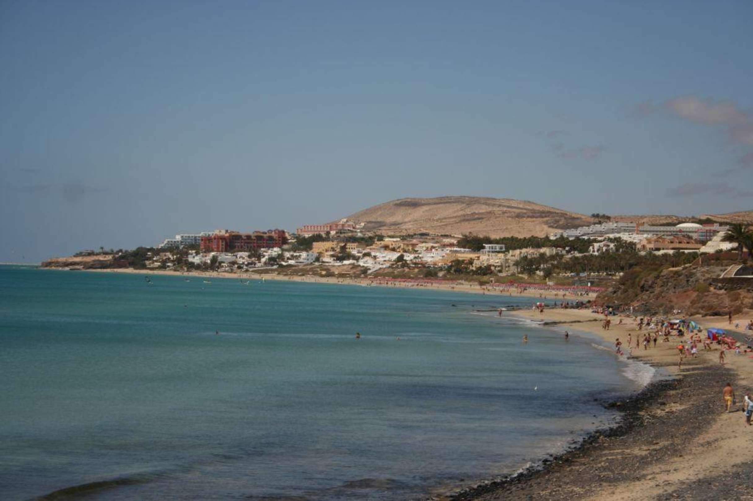 Die Costa Calma von der Hotel Anhöhe fotografiert. Diese Aussicht hat man auch wenn man auf der Terasse der Strand Snack Bar Mittag essen tut. Es ist gerade Ebbe. Zu sehen an den Steinen die normal unter Wasser wären.