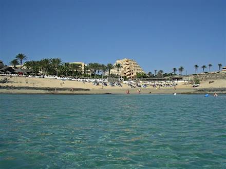 Blick vom Wasser aus auf Hotel/Hotelstrand