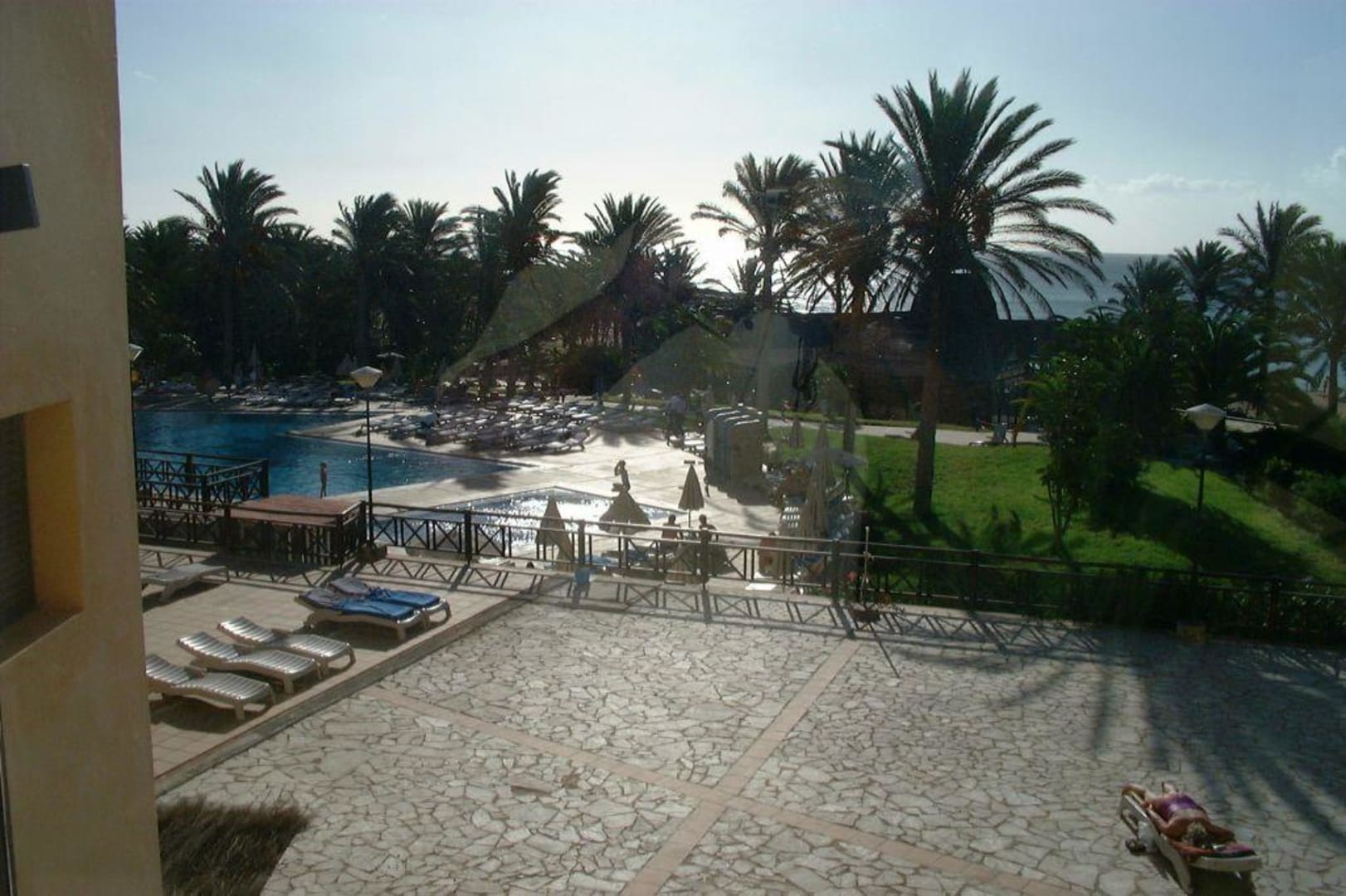 Blick auf den Liegebereich des PoolsIm Vordergrund sieht man noch die alte Pflasterung, links und im Hintergrund die Neue, die Poolduche funktionierten leider nicht, im Hintergrund kann man die Snackbar undeutlich wahrnehmen. Der Pool auf diesem Bild ist der unbeheizte untere Pool, gut für Streckenschwimmen.