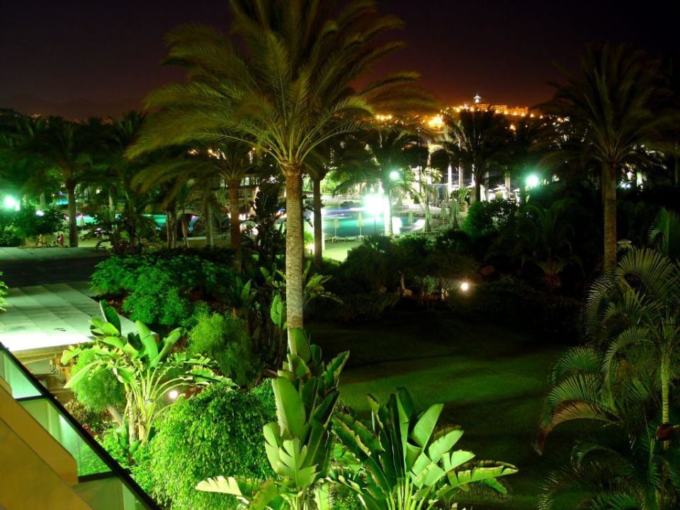 Nächtlicher Blick vom Balkon auf Garten und Pool