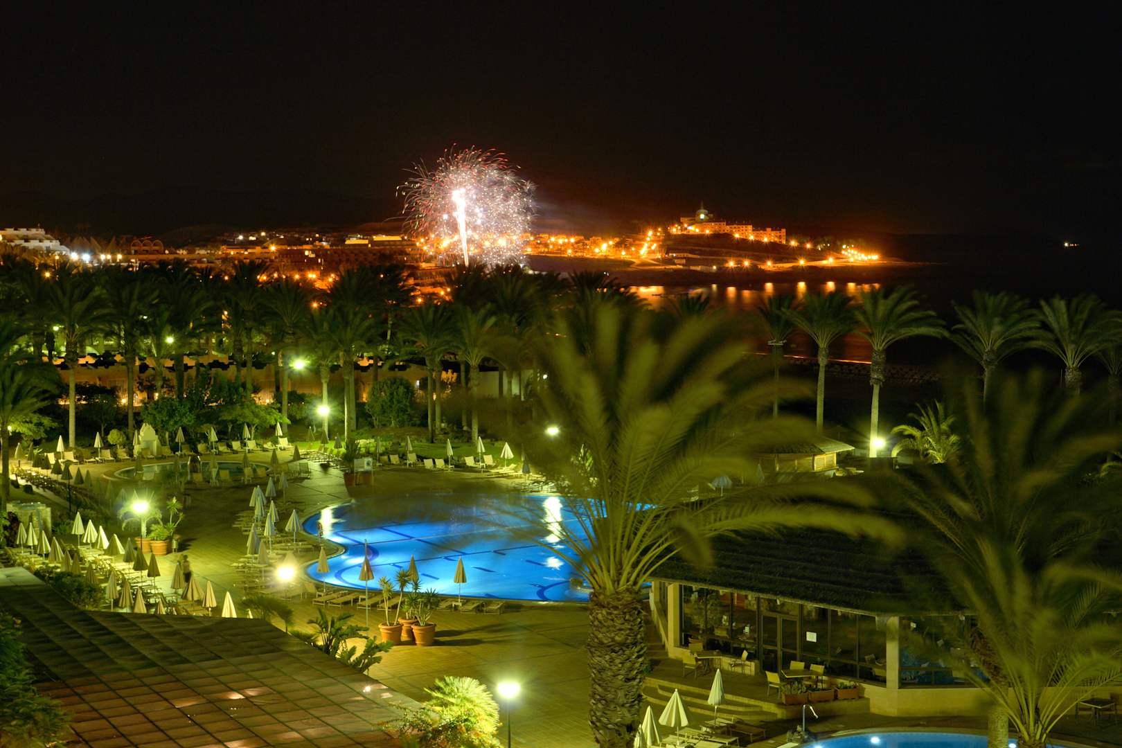 Nachtaufnahme aus dem 3. Stock mit zufälligem Feuerwerk über Costa Calma.