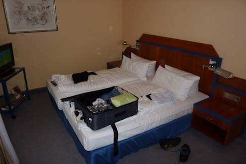 Blick auf Bett und TV Zimmer 243