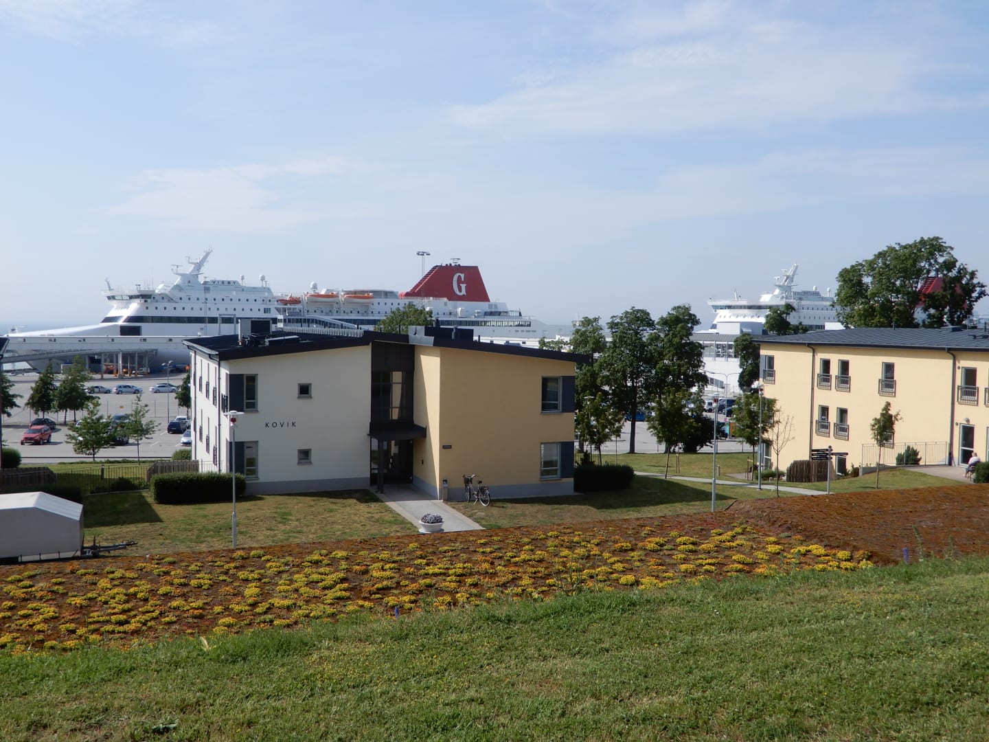 Blick auf zwei Häuser des Hotels mit dem Fährhafen im Hintergrund.