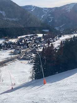 Ausblick aus der Gondel auf den kleine Skiort und das Hotel. Erste Haus rechts auf dem Bild!