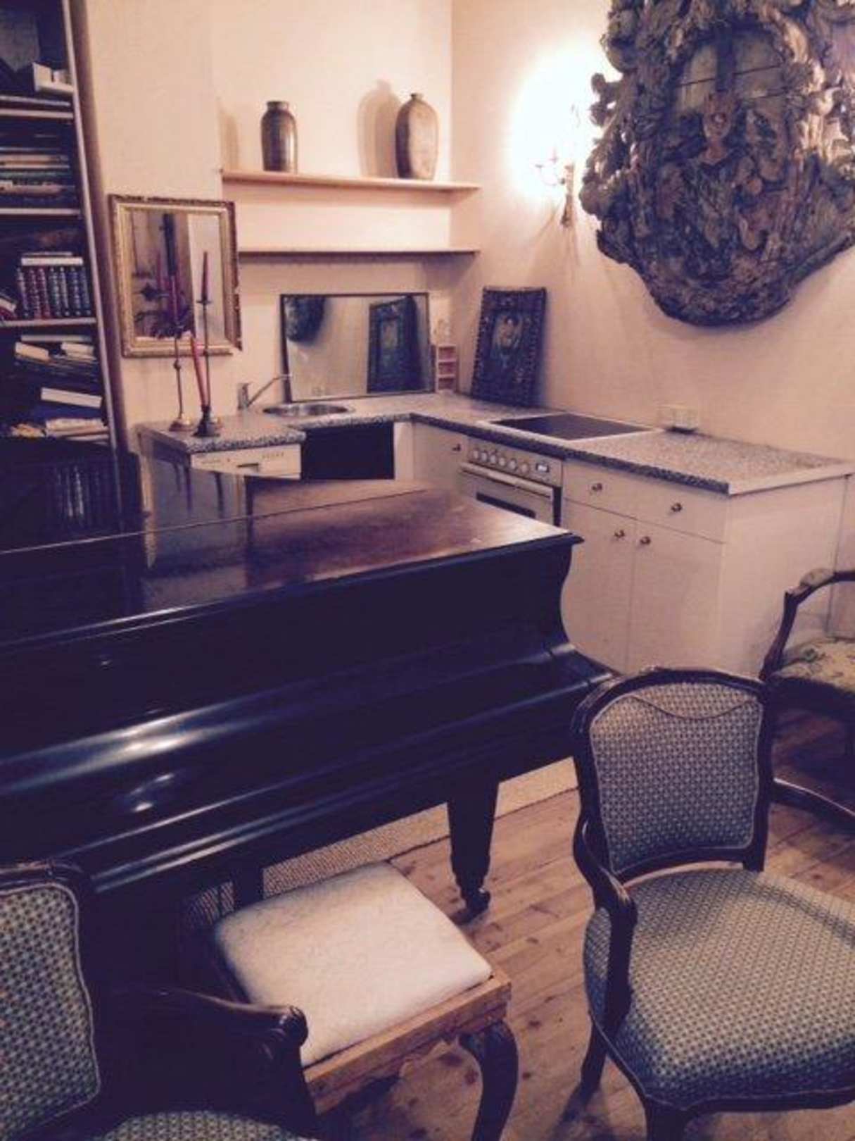 Dieses Bild zeigt den Ruheraum des Hotels, Dieser besteht aus einer alten Küche, in der ein Klavier abgestellt ist, Es sieht aus wie in einem Möbellager.