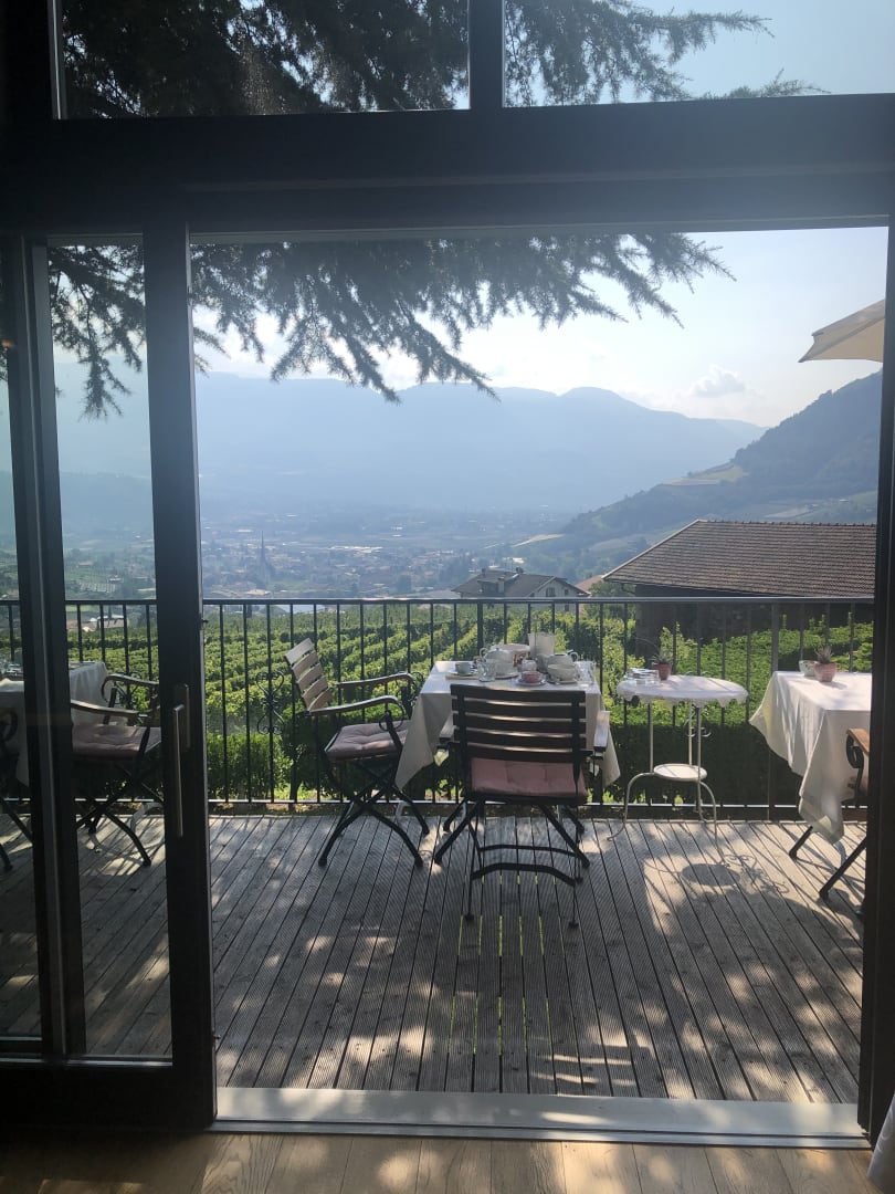 Der Blick vom Frühstücksraum zur Frühstücksterrasse