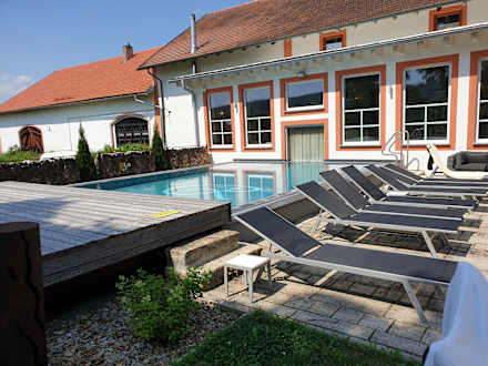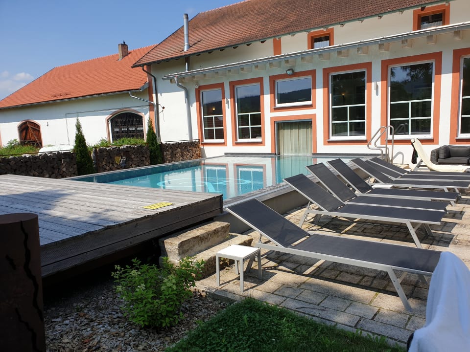 Der Aussenpool mit Sonnenliegen.
