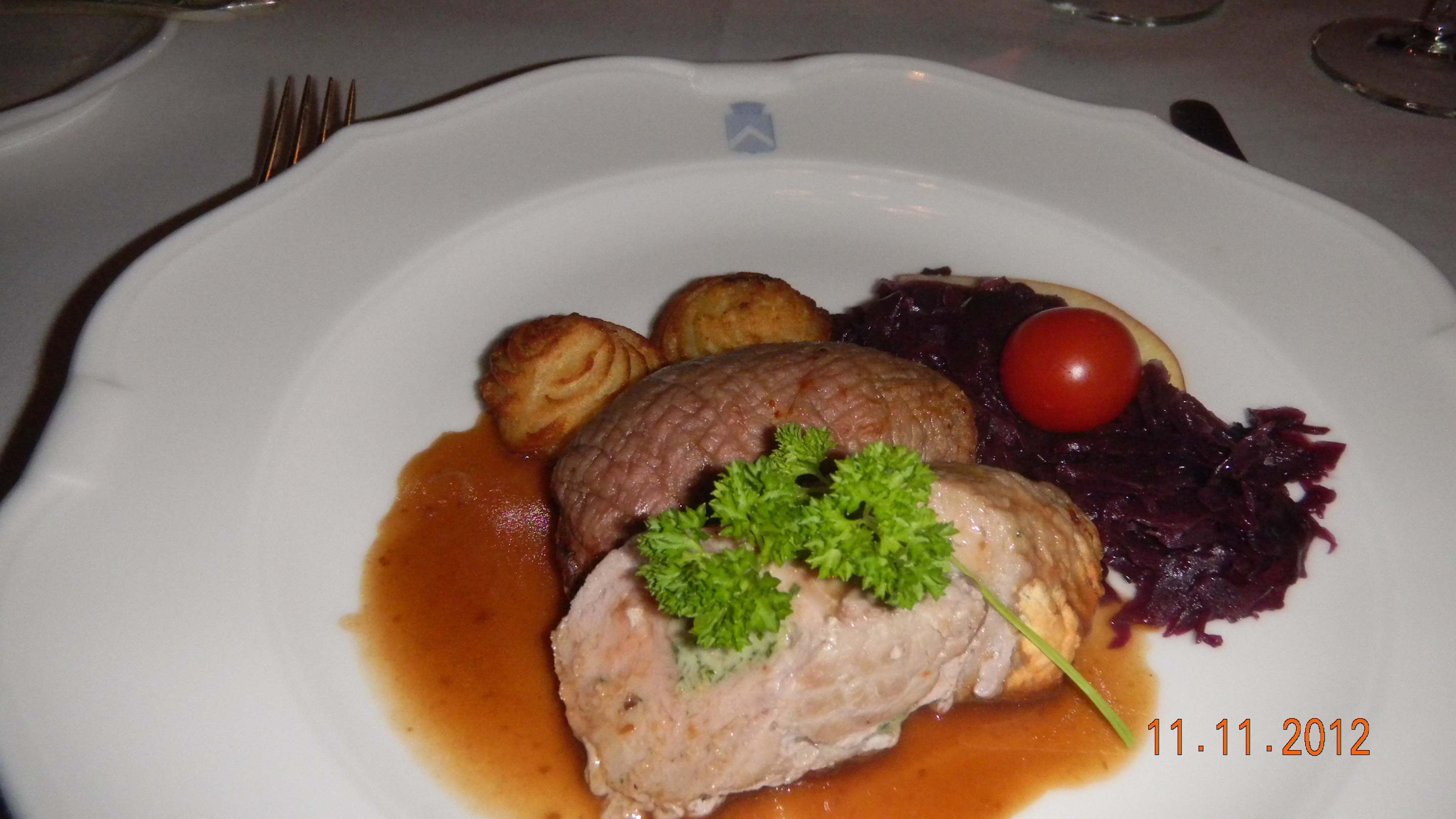Kalbsröllchen an Rotkohl und Herzoginkartoffeln