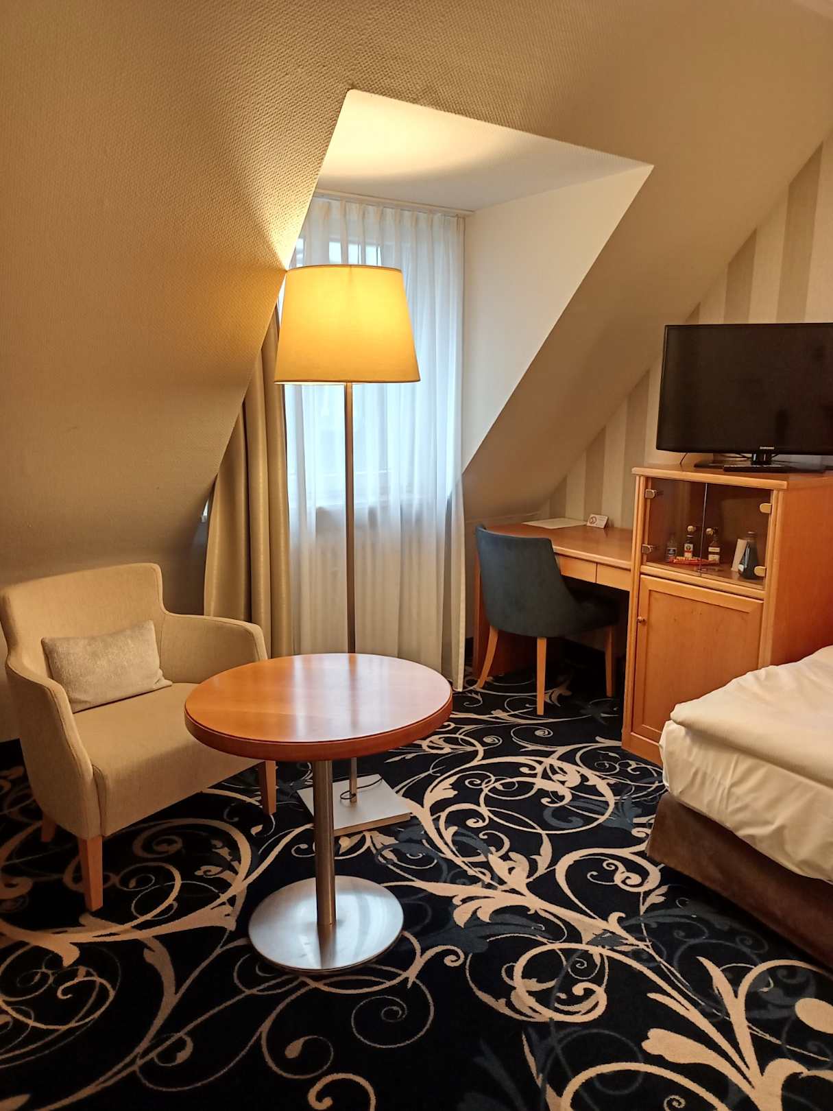 Zimmer 414. Sehr klein geratene, beengende Mansarde.