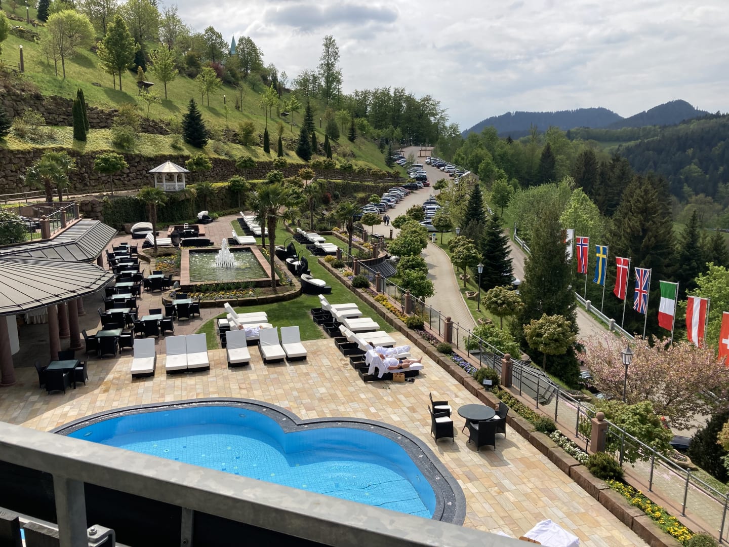 Wunderschöne Gartenanlage mit Rhododendren, Hortensien, Rosen. Blühten leider noch nicht. Blick von einer Gästesuite auf einen Teil des Aussenpools