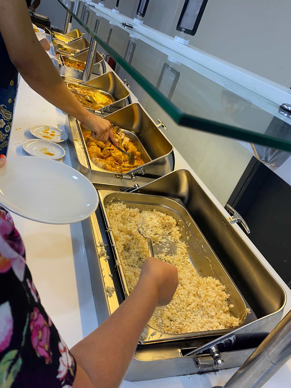 Mittagessen. Mehr Warme Speisen als auf dem Bild sind nicht vorgeben. („Hotel“ hat 180 Zimmer)