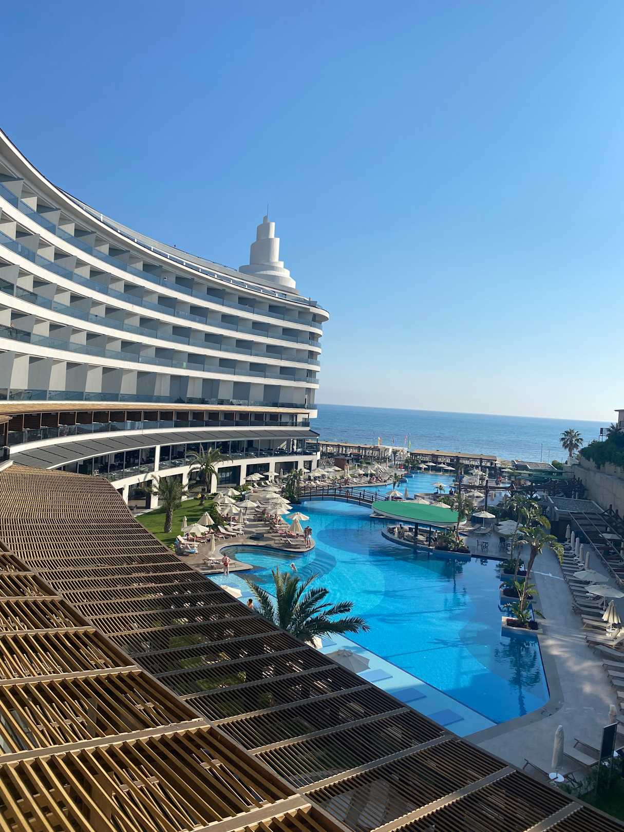 Ausblick von der Bar aus über den Pool Richtung Meer.