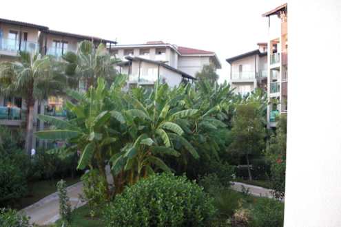 Blick auf den "Broadway" der durch die gesamte Gartenanlage führt. Hier sieht man oben in der Mitte das Gebäude 1, mit Rezeption