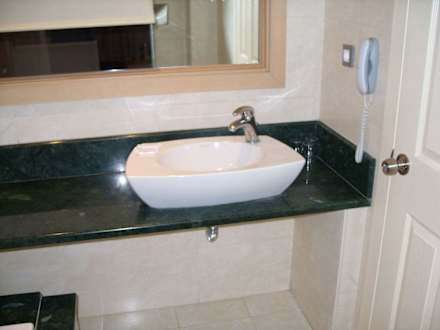 Teil des BadezimmersMan sieht hier das Waschbecken und den Spiegel, ein Telefon ( warum das da war ?) Links von einem ist die Badewanne