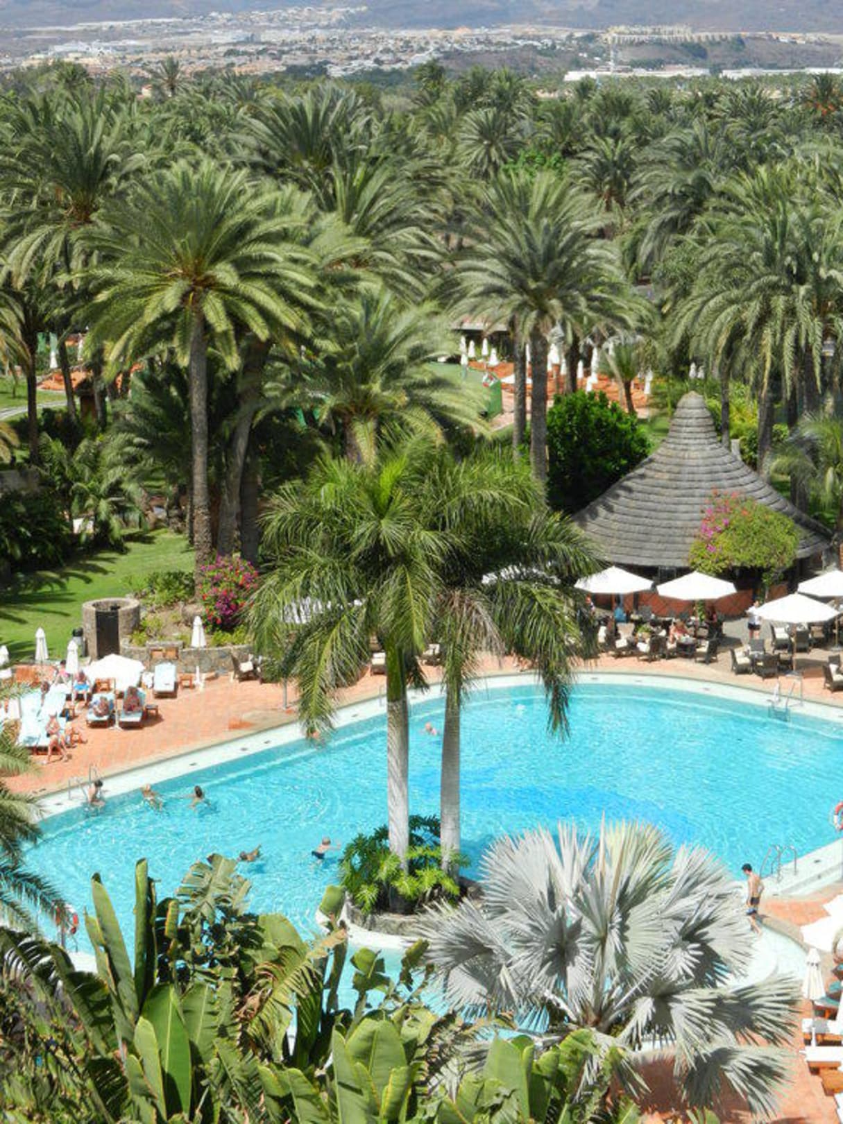 Aussicht von der 7. Etage auf Pool und Garten