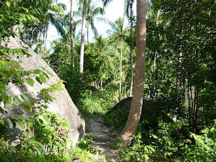 Auf diesem schmalen Pfad läuft man durch einen Palmenhain in ca. 5 Minuten zum Strand.