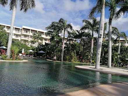 Entspannungspool (Pool 3), im Hintergrund Gebäude 9. Hier lief stets entspannende Musik und es gab Schaumstoffmatratzen, mit denen man sich durch den Pool treiben lassen konnte.