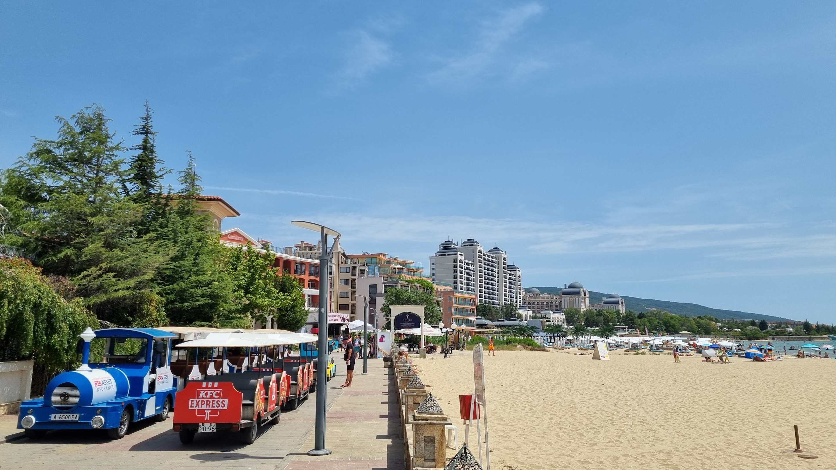 Im Hintergrund das Hotel und vorne die Haltestelle der Bimmelbahn