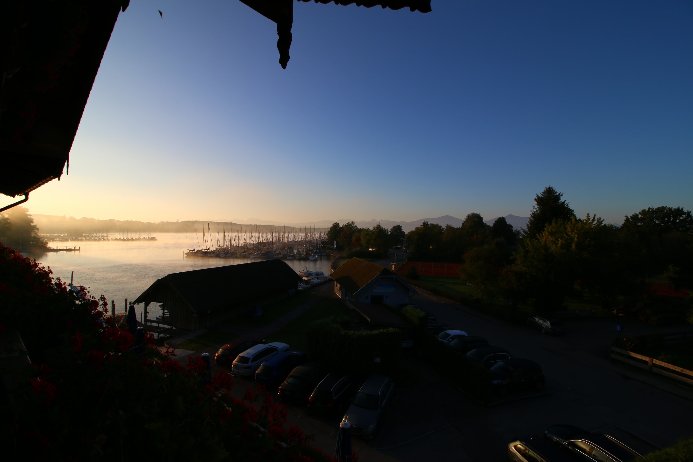 Hier geht der Blick vom Balkon des Zimmers auf den See am Morgen.