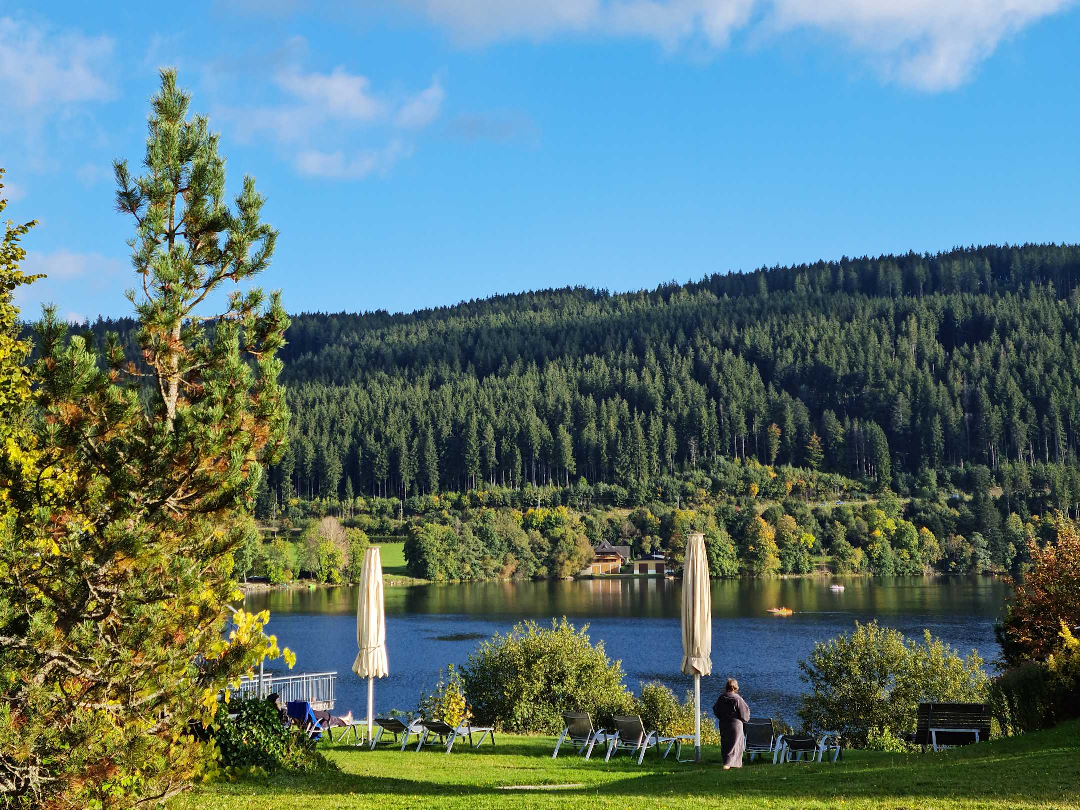 Blick aus dem Hotelgarten auf den See.