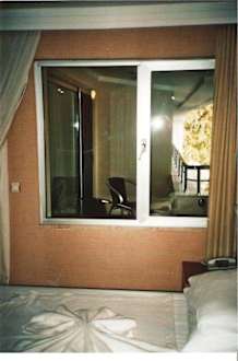 Balkon vom Nachbarzmmer.Dies ist unser Zimmer mit der Nr.440. Leider gehört der Balkon zum Nachbarzimmer. Es ist echt toll, wenn morgens schon fremde Leute vor deinem Bett herumlaufen. Oder Abends vor unserem Zimmer sich unterhalten. Mit dem Lichtschalter - links neben dem Fenster konnten wir dafür auf dem Balkon das LIcht ein und ausschalten. Sehr sinnvoll, wenn der Balkon von uns gar nicht genutzt werden kann. Aus einem Durchgangszimmer wurden einfach 2 Zimmer gemacht.