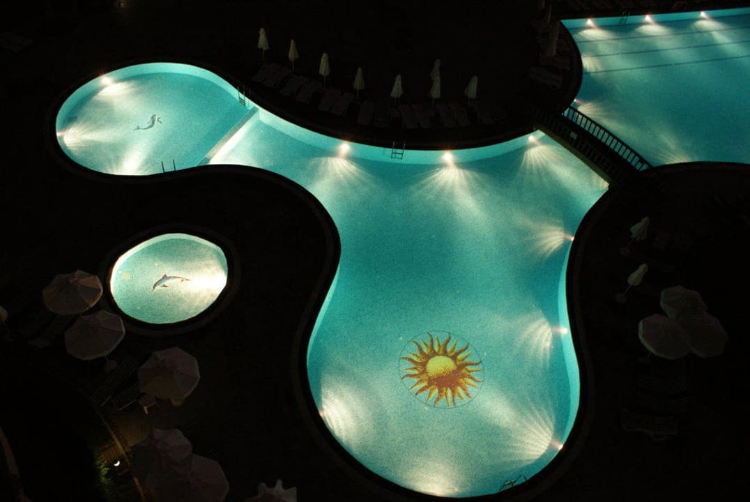 Pool vor dem Haupthausvom Balkon am Abend Fotografiert