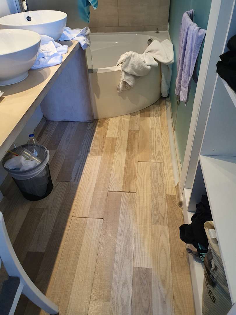 Das offene Bad. Die Türe der Dusche ist undicht, sodass das Wasser austreten kann. Das Laminat ist aufgeweicht und soweit dass ich mir den Zeh verletzt habe