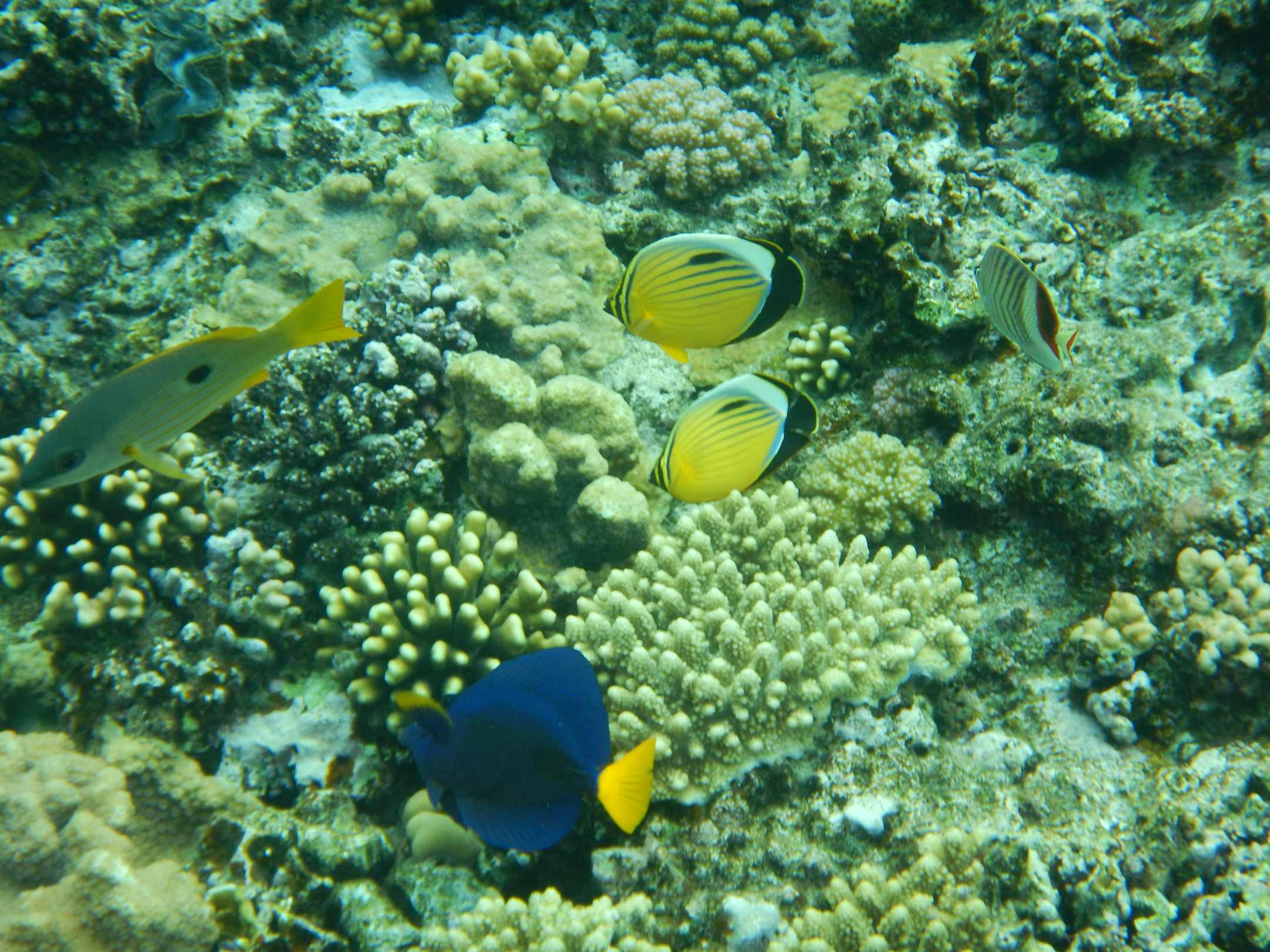 StrandVon links: 1Einfleckschnapper, 1blauer Segelflosser-Doktorfisch, 2 Rotmeer-Rippenfalter-Fische, 1 Rormeer-Winkelfalter-Fisch.