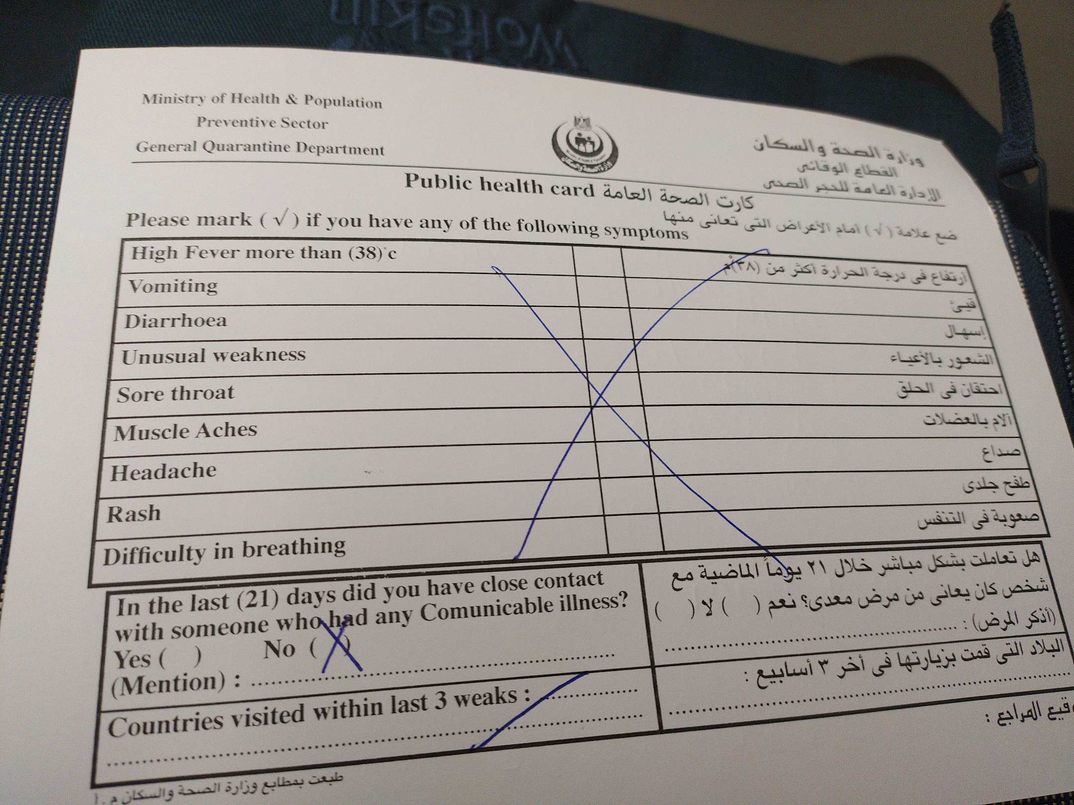 SonstigesEinreise Formular das aufgrund Corona Virus nach Ankunft am Flughafen (Marsa Alam) im Flugzeug ausgefüllt werden muss.