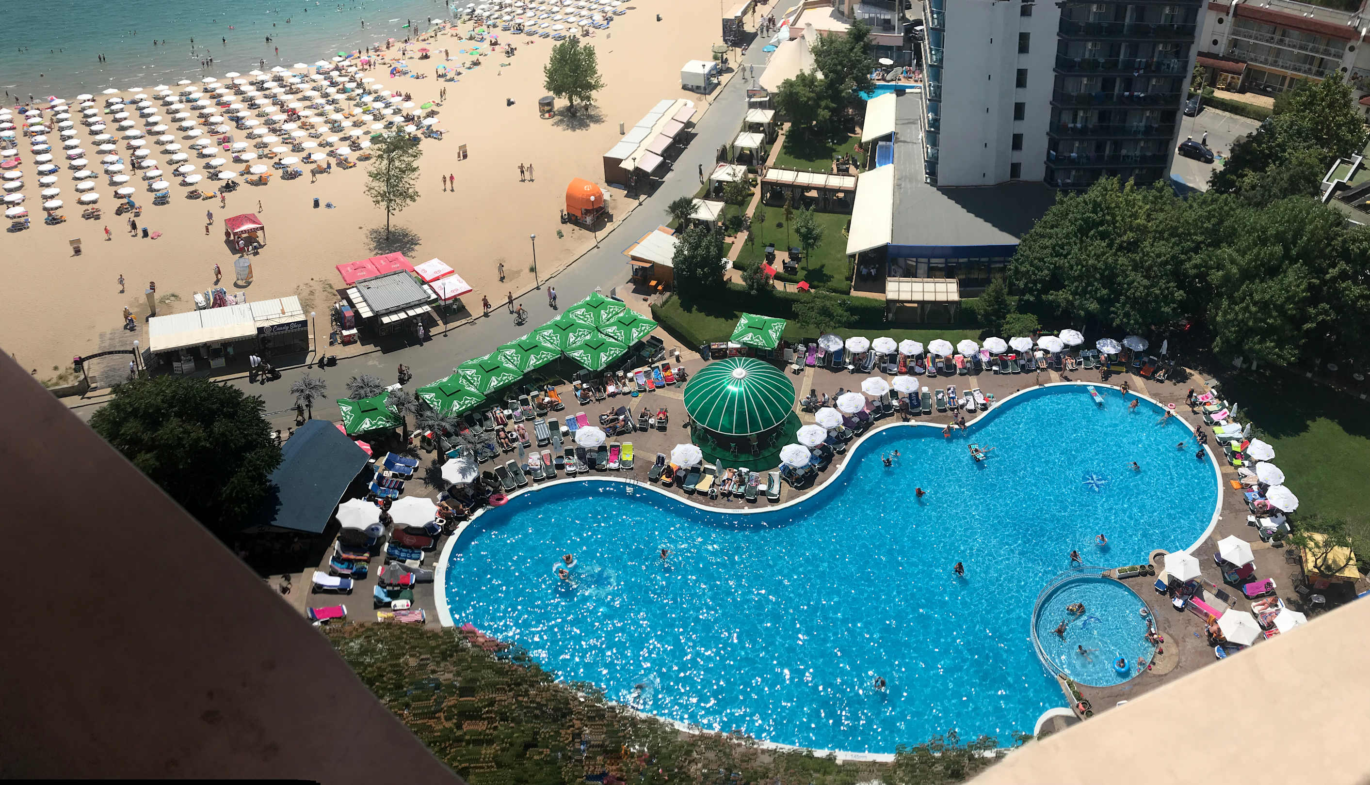 Alles was grün ist darf nicht benutzt werden da es zum Nachbar Hotel gehört! ( liegen , Poolbar) Die Poolbar ganz links unten mit dem dunkelblauen Dach ist für Hotelgäste.