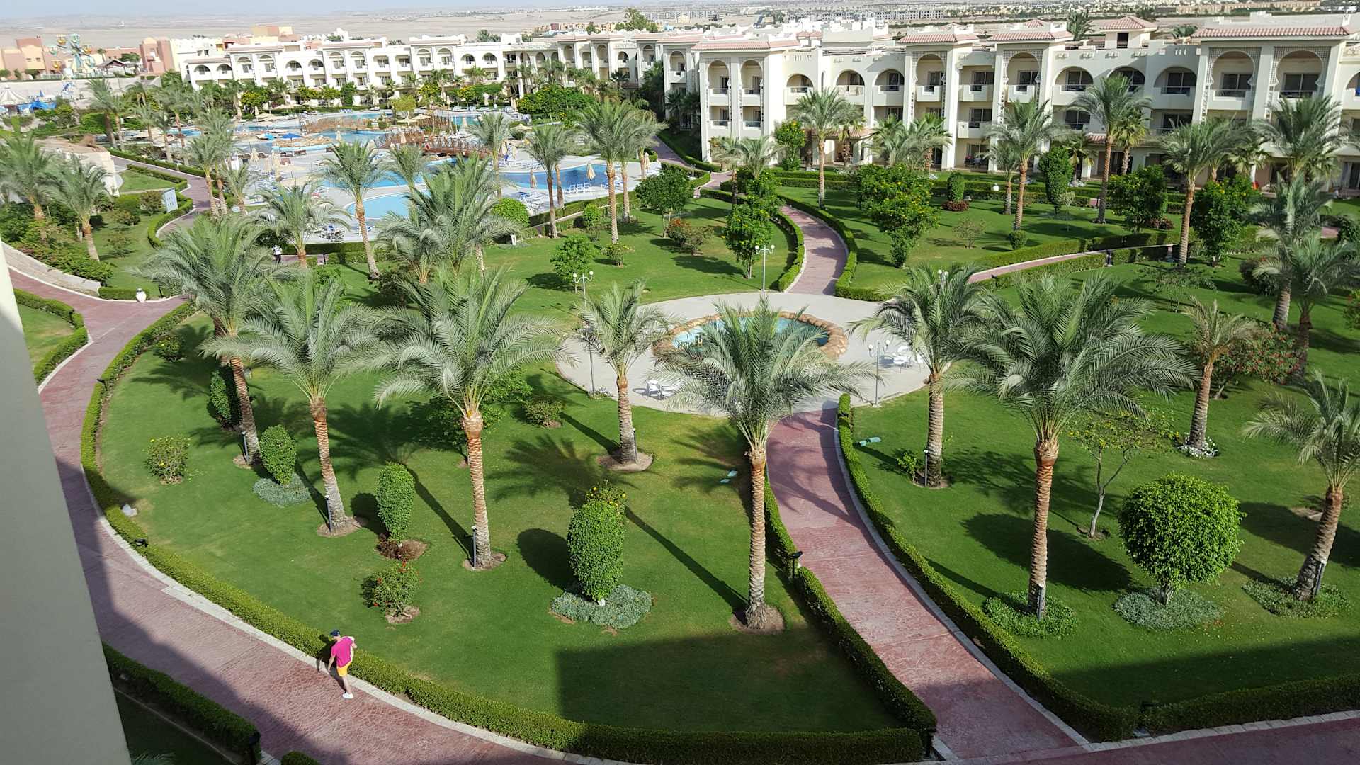 Blick aus dem Zimmer zum Poolbereich.