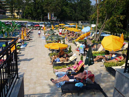 Die Liegen am Pool waren immer zu dreien Aufgestellt. Lag nur ein Pärchen da, war eine Liege zuviel. Die Schirme waren ein Witz. Eine Windboe und diese fielen um